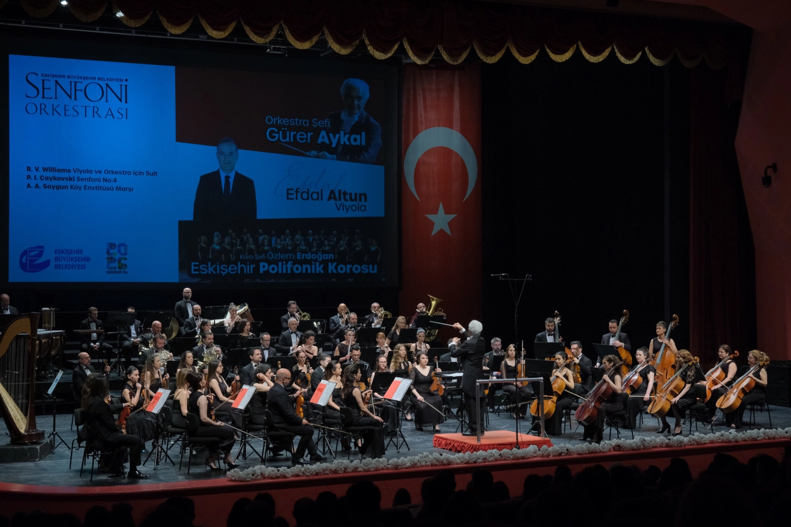 Eskişehir Büyükşehir Belediyesi Senfoni Orkestrası, bu hafta orkestra şefi Gürer Aykal'ın yönetiminde, viyola sanatçısı Efdal Altun'un solistliği ve koro şefi Özlem Erdoğan yönetimindeki Eskişehir Polifonik Korosu'nun eşliğiyle anlamlı bir konsere imza attı.