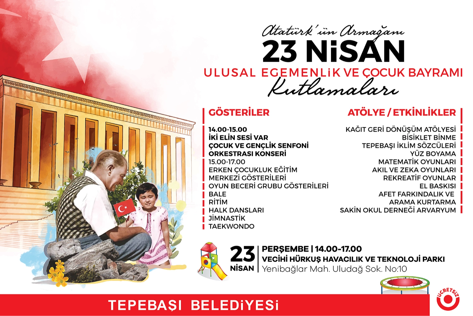 Tepebaşı Belediyesi milli günlerde vatandaşlar için özel etkinlikler düzenlemeye devam ediyor. Uluönder Gazi Mustafa Kemal Atatürk’ün tüm dünya çocuklarına armağan ettiği 23 Nisan Ulusal Egemenlik ve Çocuk Bayramı Tepebaşı’nda coşkuyla kutlanacak. Vecihi Hürkuş Havacılık ve Teknoloji Parkı’nda 23 Nisan Perşembe günü 14.00-17.00 saatleri arasında birbirinden renkli etkinlikler, özellikle çocuklar olmak üzere kent halkı ile buluşacak.