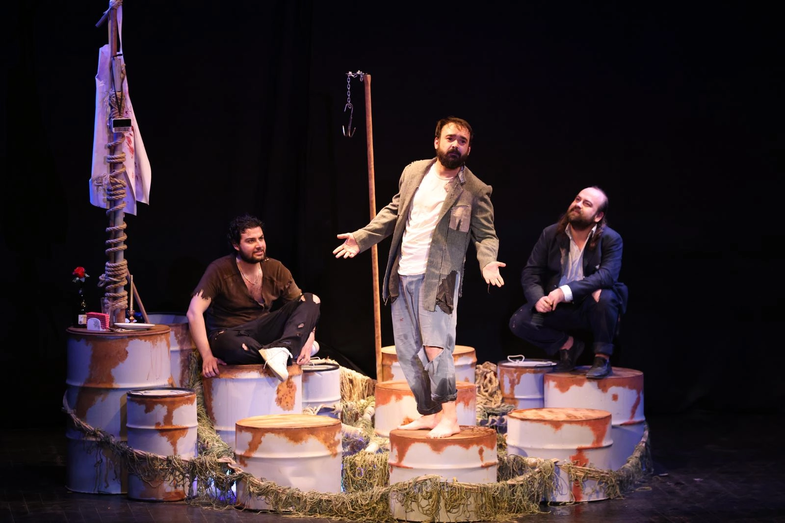 Odunpazarı Belediye Tiyatrosu, yeni oyunu “Açık Denizde”nin prömiyeriyle seyirciyi sahnenin ortasında kurulan dar, sarsıcı bir dünyaya davet etti. Absürd tiyatronun usta kalemi Sławomir Mrożek’in metni, ilk andan itibaren salonu kuşatan bir gerilimle hayat bulurken, izleyiciyi yalnızca bir hikâyeye değil, insan doğasının karanlık kıyılarına doğru bir yolculuğa çıkardı.