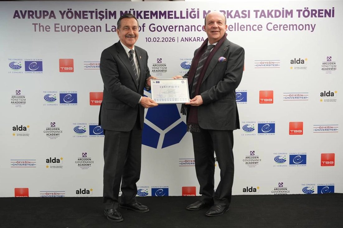 Argüden Yönetişim Akademisi Mütevelli Heyeti Başkanı Dr. Yılmaz Argüden, Avrupa Yönetişim Mükemmelliği Markası’nı Tepebaşı Belediyesi adına Başkan Ahmet Ataç’a sundu.