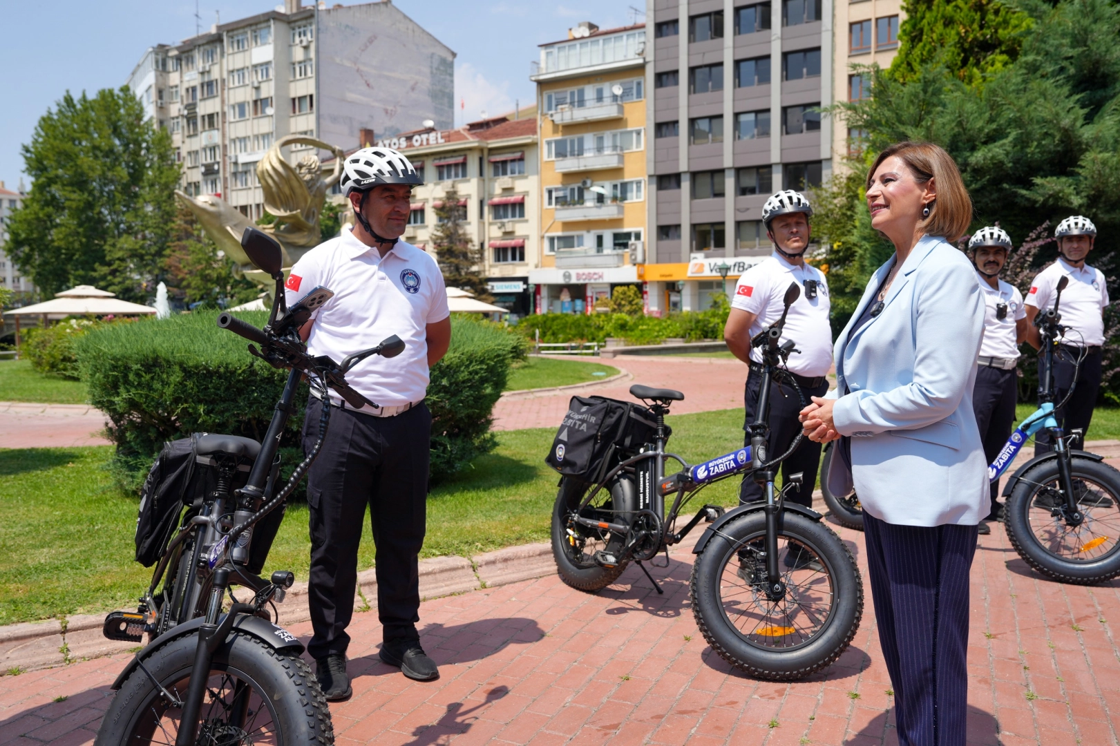 Eskişehir Büyükşehir Belediyesi, çevreci ve hızlı ulaşım için zabıta ekiplerini elektrikli bisikletlerde donattı. Yeni ekipler özellikle yaya yolları, parklar ve bisiklet yollarında görev yapacak. Büyükşehir Belediye Başkanı Ayşe Ünlüce, uygulamanın hem şehir içi bisiklet kullanımını teşvik edeceğini, hem de sürdürülebilir şehircilik vizyonuna katkı sağlayacağını vurguladı.