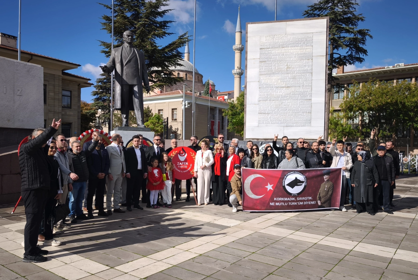 Valilik Meydanı’nda bulunan Atatürk Anıtı’na çelenk sunumu, saygı duruşu ve İstiklal Marşı'nın okunmasının ardından bir açıklama yapan Zafer Partisi Eskişehir İl Başkanı Hasan Demir şu ifadeleri kullandı;