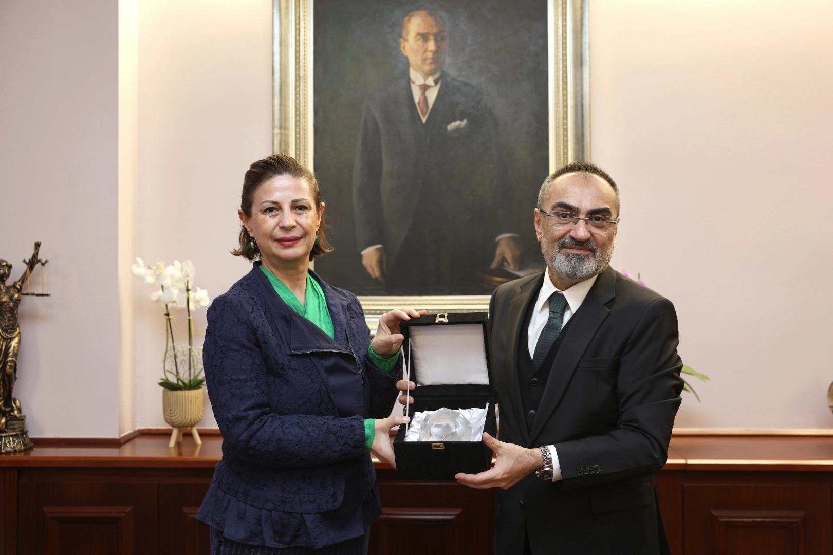 Türkiye Belediyeler Birliği Genel Sekreteri Suat Yıldız, Genel Sekreter Yrd. Dr. Şengül Altan Arslan, Özel Kalem Müdürü Nurdan Türeci Akova ve Basın Yayın Müdürü Nida Yılmaz Eskişehir’e gelerek Avrupa Yönetişim Mükemmelliği Markası (ELoGE) ödülünü Başkan Ayşe Ünlüce’ye makamında takdim etti.