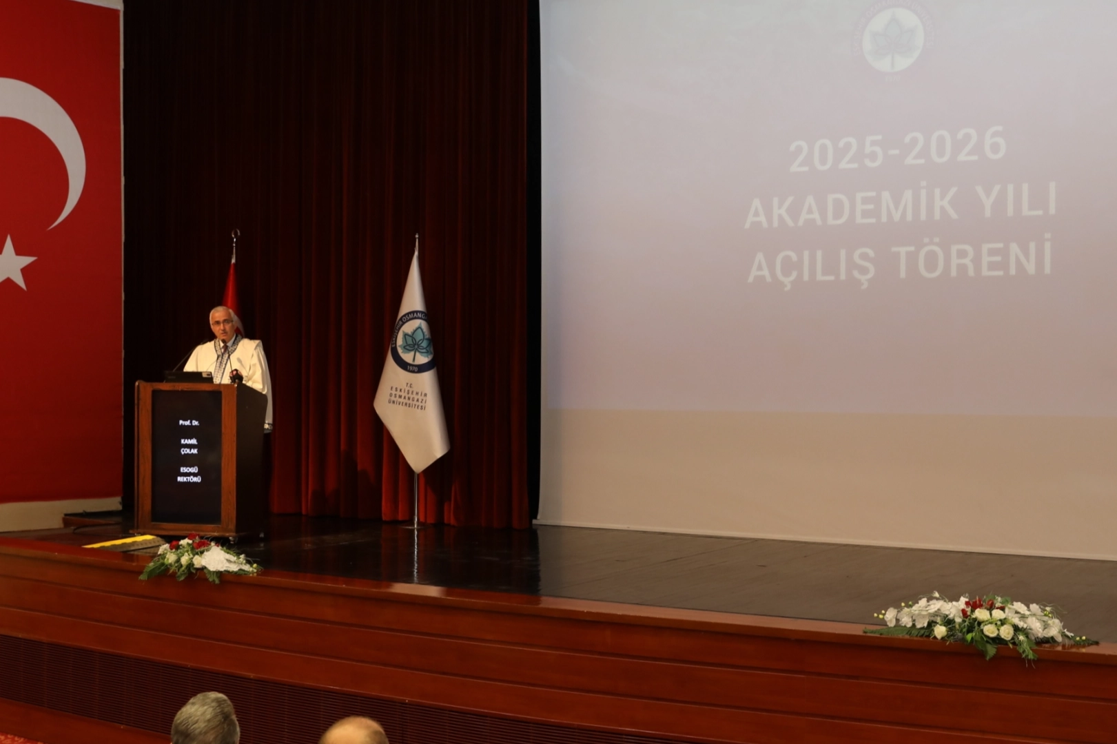 Eskişehir Osmangazi Üniversitesi (ESOGÜ) 2025-2026 Akademik Yılı Açılış Töreni, ESOGÜ Kongre ve Kültür Merkezi’nde gerçekleşti. Açılış etkinlikleri ESOGÜ Rektörü Prof. Dr. Kamil Çolak tarafından ESOGÜ Atatürk ve Gençlik Anıtı’na çelenk konulmasını takiben, akademik ve idari personelin de katılımıyla gerçekleşen saygı duruşu ve İstiklal Marşı’nın okunması ile başladı.