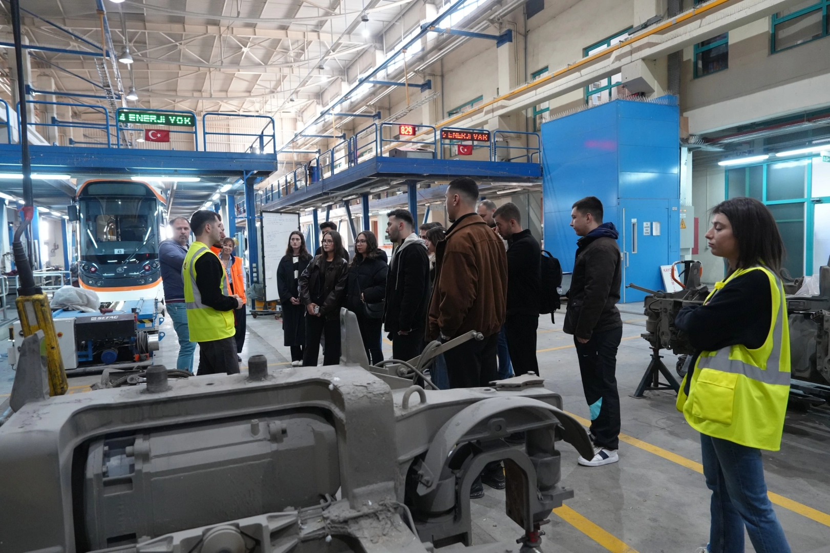 Öğrenciler, ESTRAM’ın genel işleyişi, sistemde kullanılan teknik özellikler, tramvay araçlarının bakım-onarım süreçleri, işletme trafik kontrol merkezi, güç sistemleri, sinyalizasyon ve haberleşme altyapısı ile raylı sistemlerin alt ve üst yapı unsurları hakkında detaylı şekilde bilgilendirildi.