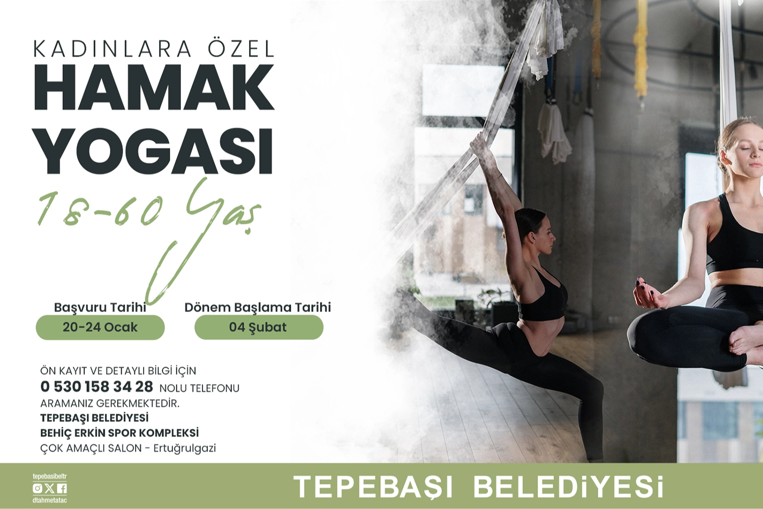 Behiç Erkin Spor Kompleksi’nde yer alan çok amaçlı salonda düzenlenecek hamak yogası programı için kayıtlar başladı. Kayıtları 24 Ocak Cuma gününe kadar devam edecek olan hamak yogası eğitimleri 4 Şubat Salı günü başlayacak. Vücut esnekliğini ve dengesini artırmasının yanı sıra kan dolaşımının gelişmesine katkıları ile de bilinen hamak yogası eğitimleri, uzman eğitmenler gözetiminde gerçekleştiriliyor.
