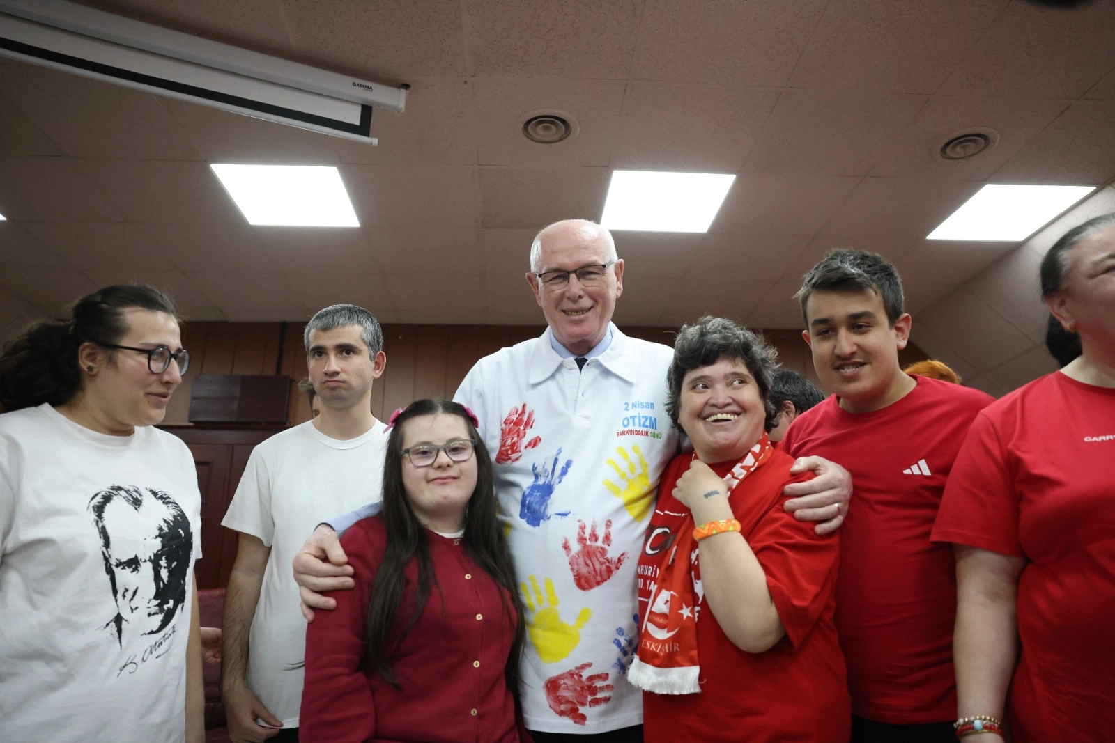 Ziyaretin en dikkat çekici anı, çocukların kendi elleriyle hazırladığı hediye oldu. Otizme dikkat çekmek amacıyla beyaz bir tişört üzerine renkli el baskısı yapan çocuklar, bu özel tasarımı Başkan Kurt’a takdim etti.