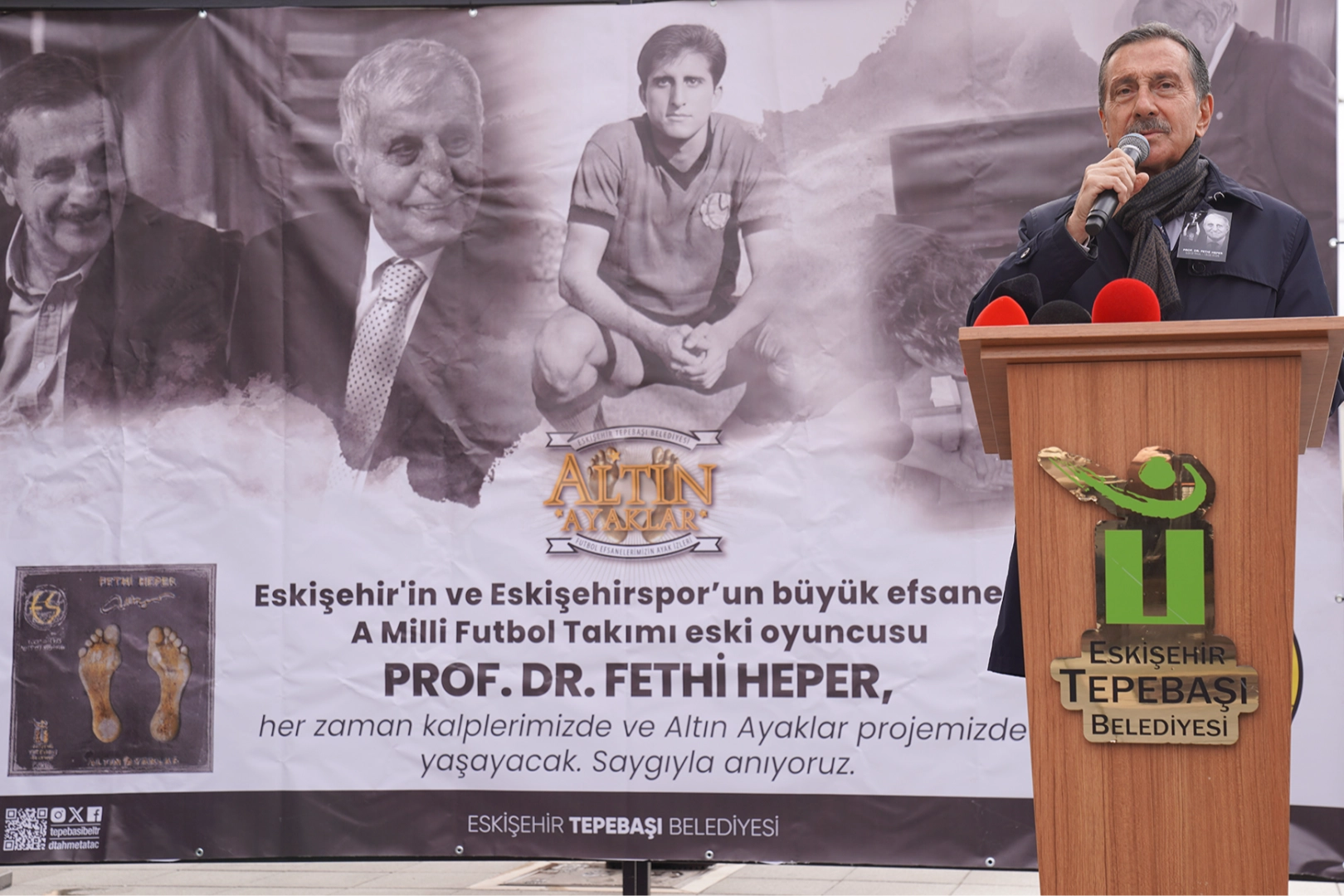 Tepebaşı Belediyesi’nin bir vefa projesi olan ve Atila Özer Karikatürlü Ev önünde bulunan “Altın Ayaklar” proje alanında 13 Şubat Perşembe günü yaşamını yitiren Eskişehirspor’un efsane futbolcusu Prof. Dr. Fethi Heper’in anısına tören düzenlendi. Fethi Heper’in ayak izinin yanında düzenlenen anma törenine Tepebaşı Belediye Başkanı Dt. Ahmet Ataç’ın yanı sıra belediye başkan yardımcıları, meclis üyeleri, Fethi Heper’in eşi Melek Heper, oğlu Jeyan Heper, aile dostları, efsane Eskişehirsporlu futbolcular, spor camiası ve vatandaşlar katıldı. Törende başta Fethi Heper olmak üzere hayatını kaybeden efsane futbolcular anısında 1 dakikalık saygı duruşunda bulunuldu.