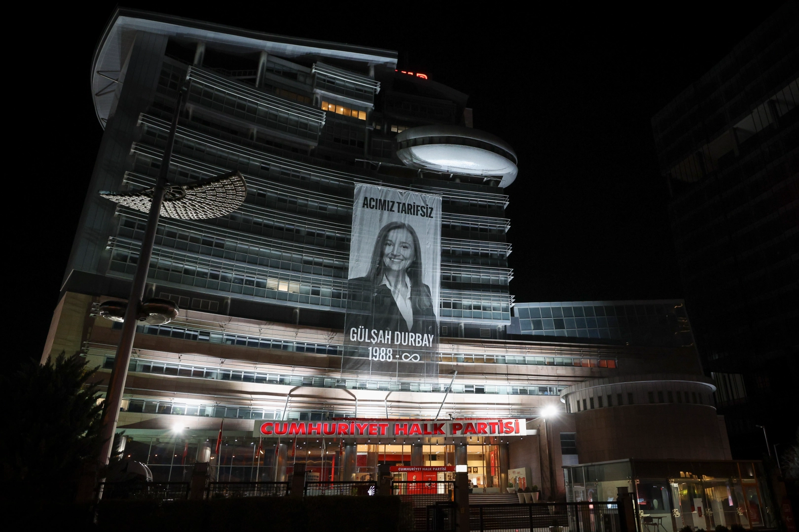Gülşah Durbay'ın fotoğrafının yer aldığı pankart ise Cumhuriyet Halk Partisi Genel Merkezine asıldı.