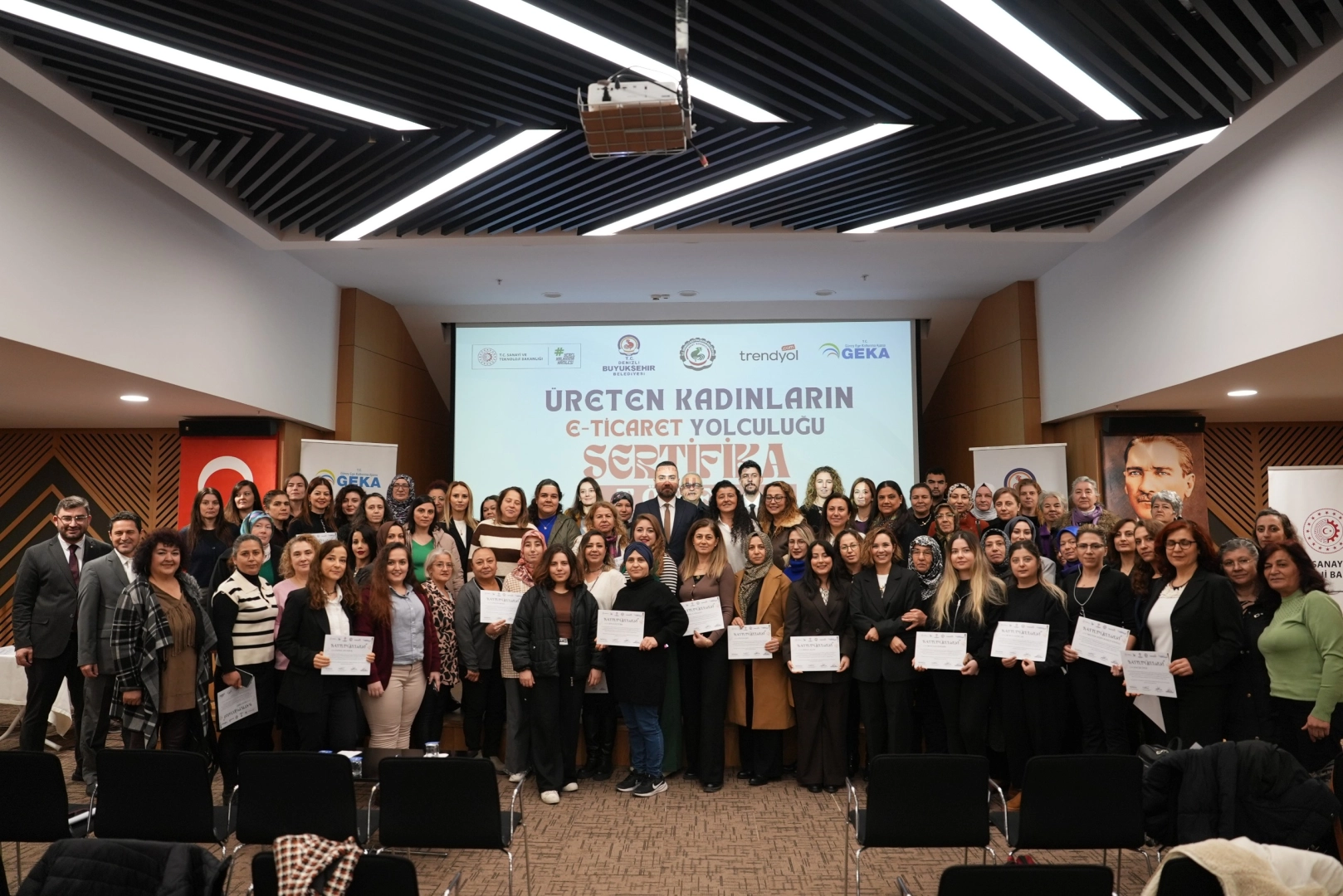 Denizli Büyükşehir Belediyesi Kent Konseyi’nin Pamukkale Üniversitesi, Güney Ege Kalkınma Ajansı (GEKA) ve Trendyol iş birliğiyle gerçekleştirilen proje kapsamında; girişimcilik, markalaşma, e-ticaret, e-ihracat, ihracat-ithalat ve ürün fotoğrafçılığı başlıklarında kapsamlı eğitimler verildi. Ekim ve Kasım aylarında toplam altı gün süren eğitim programı, kadın girişimcilerin dijital ticaret alanında bilgi ve yetkinliklerini artırmayı hedefledi. Eğitimleri başarıyla tamamlayan katılımcılar için Denizli Büyükşehir Belediyesi Kongre ve Kültür Merkezi’nde sertifika töreni düzenlendi. Törene Denizli Büyükşehir Belediye Başkanı Bülent Nuri Çavuşoğlu, Kent Konseyi Başkanı Ali Marım, Kent Konseyi Genel Sekreteri Baran Akın ve sertifika almaya hak kazanan kadınlar katıldı.