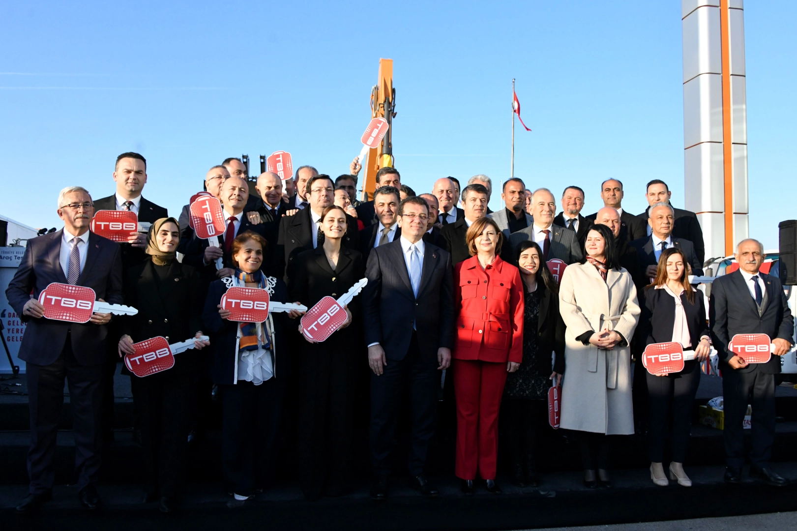 Konuşmasının ardından İmamoğlu, törene katılan TBB Encümen Üyeleriyle birlikte hibe araçların anahtarlarını belediye başkanları ve yöneticilerine takdim etti.